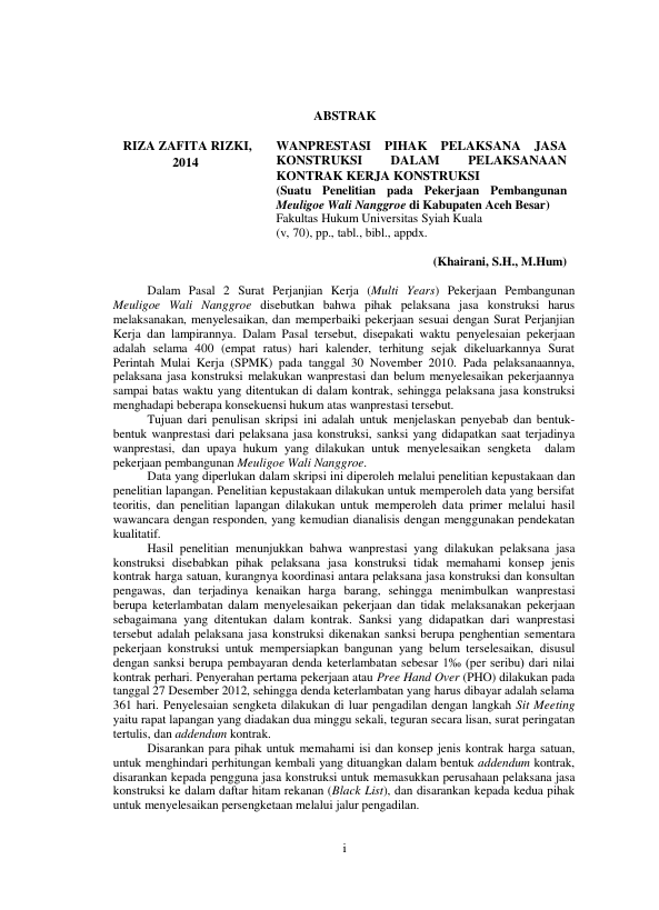 Baca Juga : WANPRESTASI DALAM KONTRAK KERJA KONSTRUKSI ANTARA PT. BERKAH SALIM PERDANA DENGAN DINAS PENDIDIKAN ACEH (SUATU PENELITIAN DI PROYEK PEMBANGUNAN ASRAMA SISWA MTSS TGK. CHIK, KABUPATEN PIDIE) (Rachmad Firdaus, 2018)