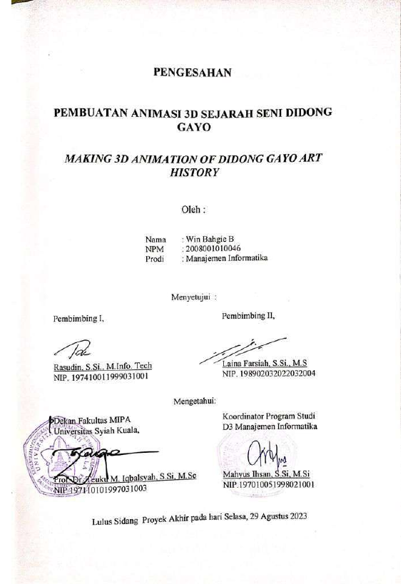 Win Bahgie B, PEMBUATAN ANIMASI 3D SEJARAH SENI RNDIDONG GAYO. Banda Aceh Fakultas MIPA (D3),2023