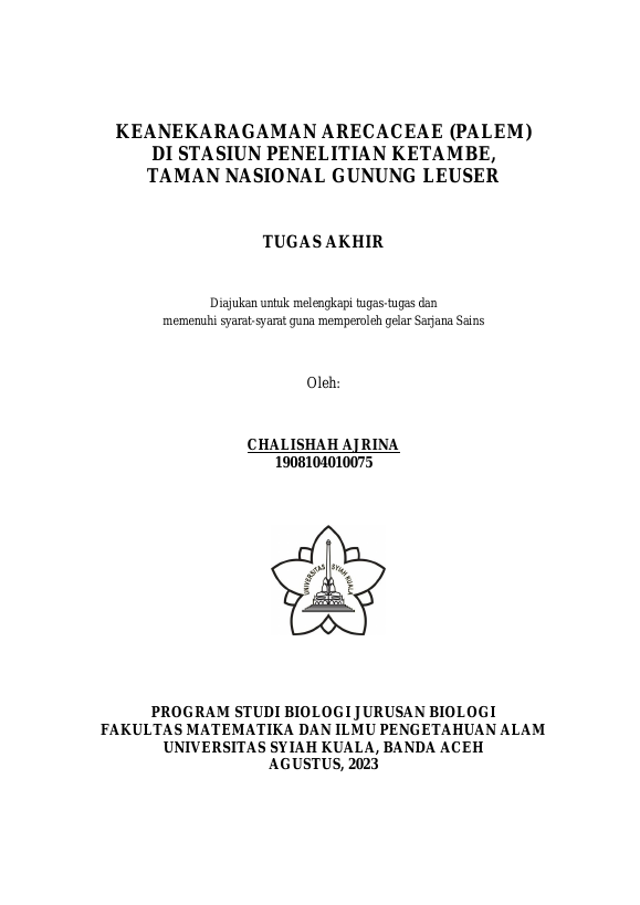 Chalishah Ajrina, KEANEKARAGAMAN ARECACEAE (PALEM) DI STASIUN PENELITIAN KETAMBE, TAMAN NASIONAL GUNUNG LEUSER. Banda Aceh Fakultas mipa,2023