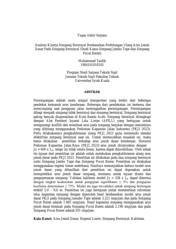 MUHAMMAD TAUFIK, ANALISIS KINERJA SIMPANG BERSINYAL BERDASARKAN PERHITUNGAN ULANG ARUS JENUH DASAR PADA SIMPANG BERSINYAL (STUDI KASUS SIMPANG JAMBO TAPE DAN SIMPANG POCUT BAREN). Banda Aceh Fakultas Teknik Sipil,2023