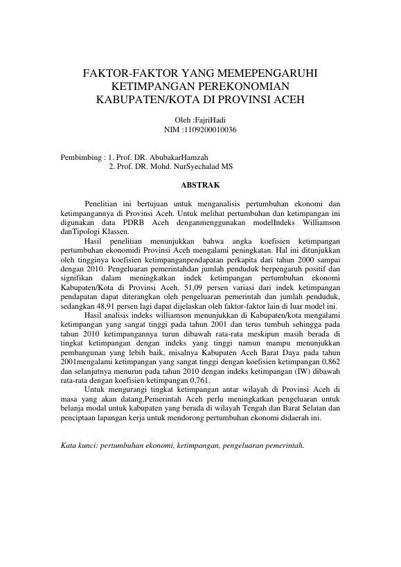 Fajri Hadi, FAKTOR-FAKTOR YANG MEMEPENGARUHI KETIMPANGAN PEREKONOMIAN KABUPATEN/KOTA DI PROVINSI ACEH. Banda Aceh Prog. Studi Magister Ilmu Ekonomi,2014