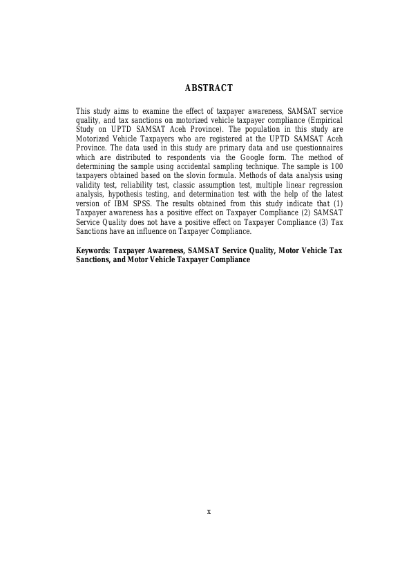 Indhira Ar Rifat, PENGARUH KESADARAN WAJIB PAJAK, KUALITAS PELAYANAN SAMSAT DAN SANKSI PAJAK TERHADAP KEPATUHAN WAJIB PAJAK KENDARAAN BERMOTOR (STUDI EMPIRIS PADA UPTD SAMSAT PROVINSI ACEH). Banda Aceh Fakultas Ekonomi dan Bisnis,2023