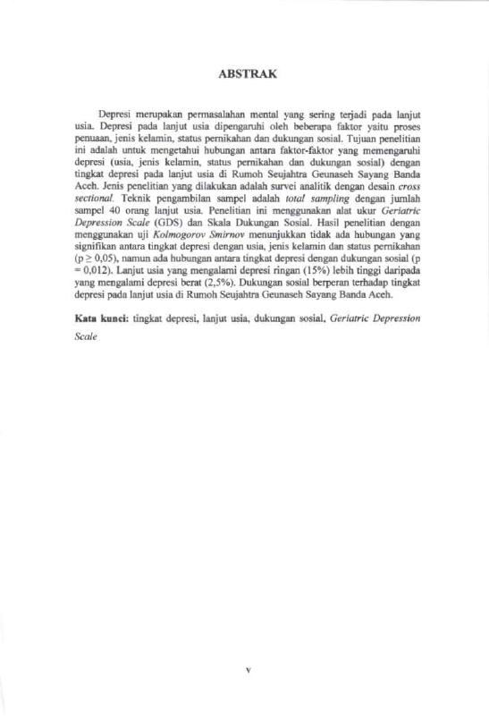 Baca Juga : HUBUNGAN FAKTOR-FAKTOR YANG MEMENGARUHI DEPRESI DENGAN TINGKAT DEPRESI PADA LANJUT USIA DI RUMOH SEUJAHTRA GEUNASEH SAYANG BANDA ACEH (Dwi Harliani Ayu Aprilia, 2015)
