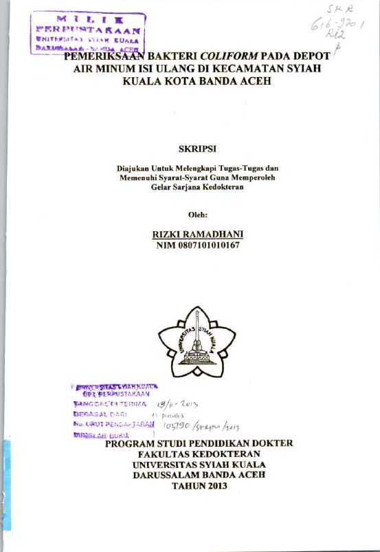 Baca Juga : KONTAMINASI BAKTERI COLIFORM PADA AIR MINUM ISI ULANG DI DESA ILIE KECAMATAN ULEE KARENG KOTA BANDA ACEH (Muhammad Iqbal Pratama Sekedang, 2014)