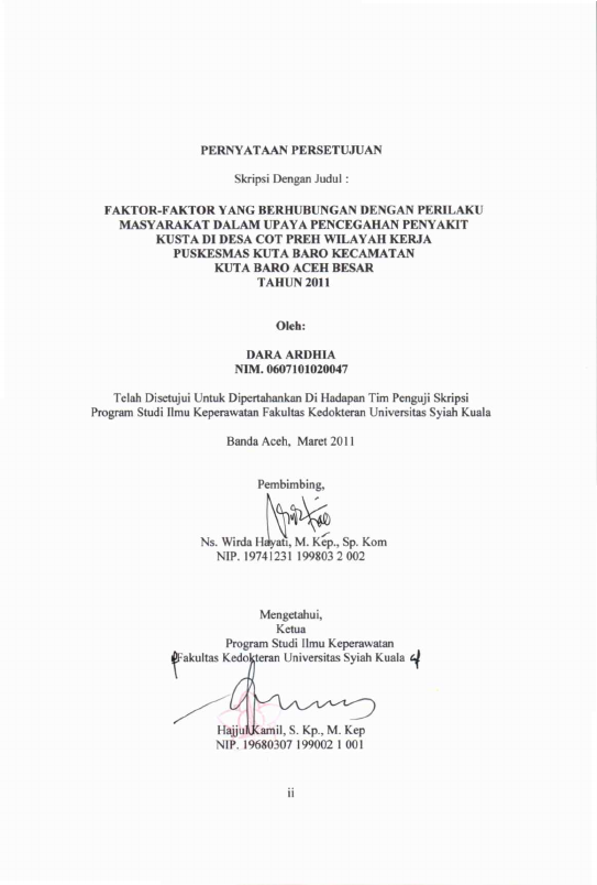 Dara Ardhia, FAKTOR-FAKTOR YANG BEHUBUNGAN DENGAN PERILAKU MASYARAKAT DALAM UPAYA PENCEGAHAN PENYAKIT KUSTA DI DESA COT PREH WILAYAH KERJA PUSKESMAS KUTA BARO KECAMATAN KUTA BARO ACEH BESAR. Banda Aceh Fakultas Kedokteran,2011