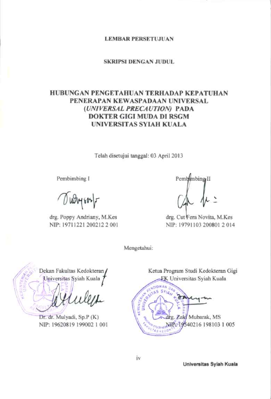 Baca Juga : HUBUNGAN PENGETAHUAN TERHADAP KEPATUHAN PENERAPAN KEWASPADAAN UNIVERSAL UNIVERSAL PRECAUTION) PADA DOKTER GIGI MUDA DI RSGM UNIVERSITAS SYIAH KUALA (RAHMI AULIYANTI, 2016)