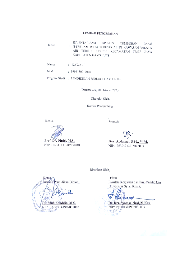 NAWARI, INVENTARISASI SPESIES TUMBUHAN PAKU (PTERIDOPHYTA) TERESTRIAL DI KAWASAN WISATA AIR TERJUN REREBE KECAMATAN TRIPE JAYA KABUPATEN GAYO LUES. Banda Aceh Fakultas KIP Pendidikan Biologi,2023