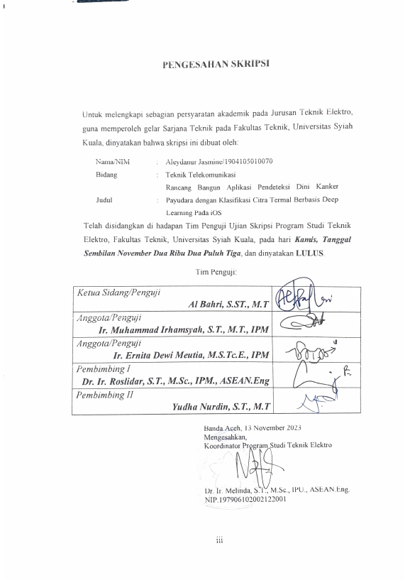 Aleydanur Jasmine, RANCANG BANGUN APLIKASI PENDETEKSI DINI KANKER PAYUDARA DENGAN KLASIFIKASI CITRA TERMAL BERBASIS DEEP LEARNING PADA IOS. Banda Aceh Fakultas Teknik Elektro dan Komputer,2023