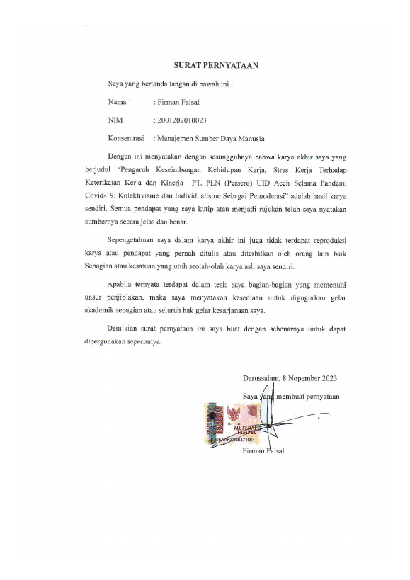 Firman Faisal, PENGARUH KESEIMBANGAN KEHIDUPAN KERJA, STRES KERJA TERHADAP KETERIKATAN KERJA DAN KINERJA PT. PLN (PERSERO) UID ACEH SELAMA PANDEMI COVID-19: KOLEKTIVISME DAN INDIVIDUALISME SEBAGAI PEMODERASI. Banda Aceh Fakultas Ekonomi dan Bisnis Magister Manajemen,2023