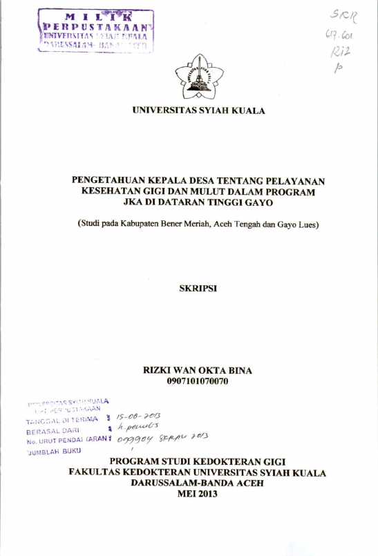 Rizki Wan Okta Bina, PENGETAHUAN KEPALA DESA TENTANG PELAYANAN KESEHATANRNGIGI DAN MULUT DALAM PROGRAM JKA DI DATARAN TINGGIRNGAYO (STUDI PADA KABUPATEN BENER MERIAH, ACEH TENGAHRNDAN GAYO LUES). Banda Aceh Fakultas Kedokteran,2013