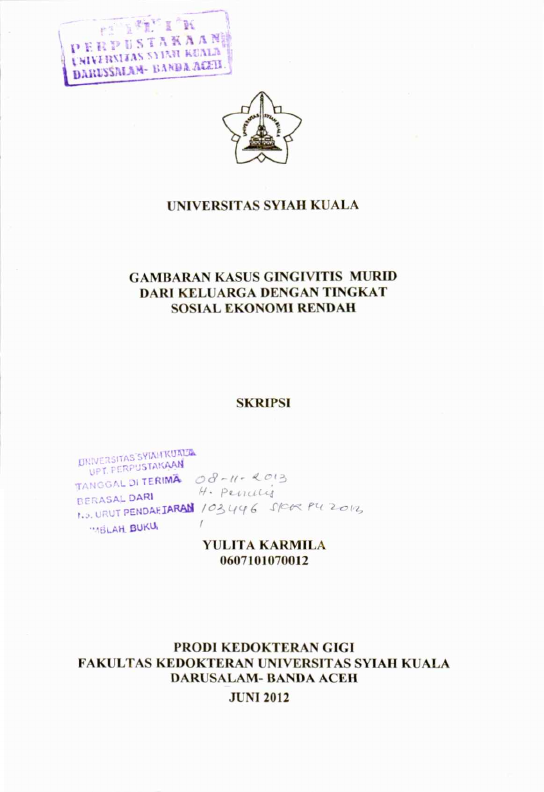 Yulita Karmila, GAMBARAN KASUS GINGIVITIS MURID DARI KELUARGA DENGAN TLNGKAT SOSIAL EKONOMI RENDAH. Banda Aceh Fakultas Kedokteran,2012