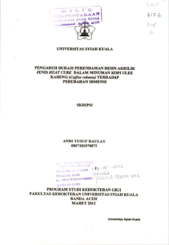 Baca Juga : PENGARUH DURASI PERENDAMAN RESIN AKRILIK JENIS HEAT CURE DALAM MINUMAN KOPI ULEE KARENG (COFFEA ROBUSTA) TERHADAP PERUBAHAN DIMENSI (ANDI YUSUF DAULAY, 2015)