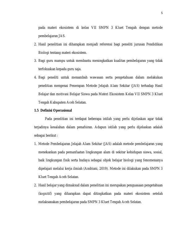 WATI RATNA DEWI, PENERAPAN METODE PEMBELAJARAN JELAJAH ALAM SEKITAR (JAS) TERHADAP HASIL BELAJAR DAN MOTIVASI BELAJAR SISWA PADA MATERI EKOSISTEM KELAS VII SMPN 3 KLUET TENGAH ACEH SELATAN. Banda Aceh Fakultas KIP Pendidikan Biologi,2023