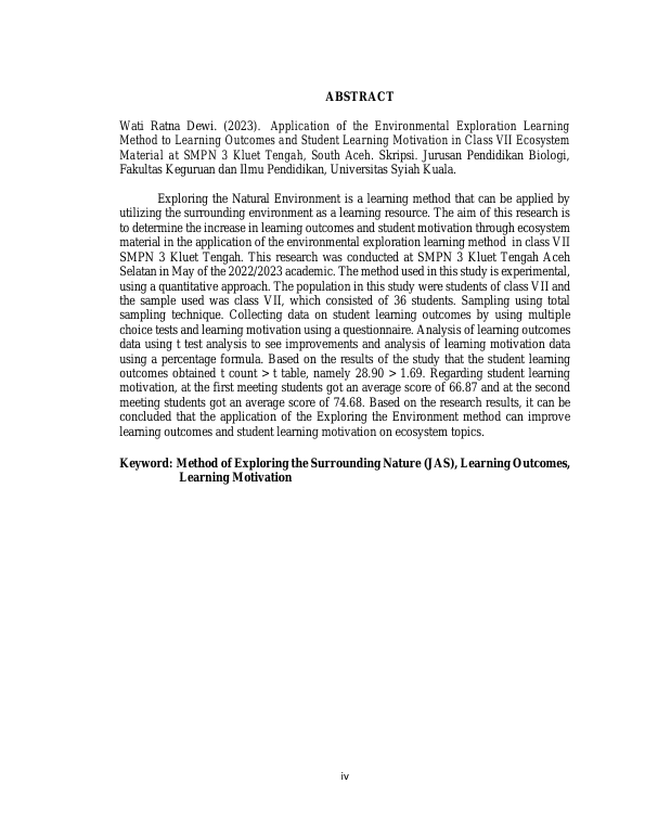 WATI RATNA DEWI, PENERAPAN METODE PEMBELAJARAN JELAJAH ALAM SEKITAR (JAS) TERHADAP HASIL BELAJAR DAN MOTIVASI BELAJAR SISWA PADA MATERI EKOSISTEM KELAS VII SMPN 3 KLUET TENGAH ACEH SELATAN. Banda Aceh Fakultas KIP Pendidikan Biologi,2023