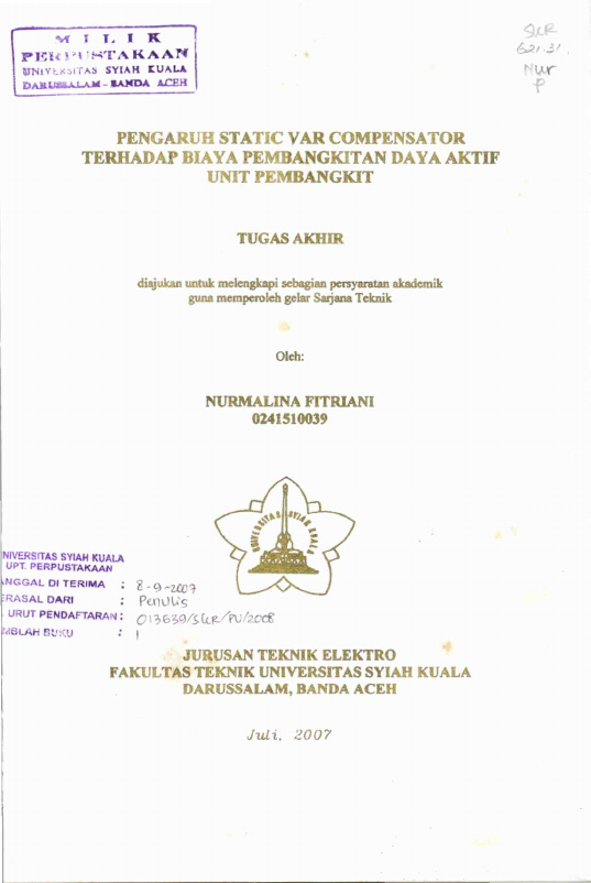 Baca Juga : PENGARUH STATIC VAR COMPENSATOR TERHADAP BIAYA PEBANGKITAN DAYA AKTIF UNIT PEMBANGKIT (Nurmalina Fitriani, 2023)