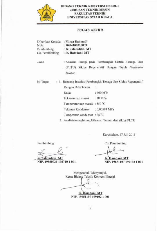 Mirza Rahmadi, ANALISIS ENERGI PADA PEMBANGKIT LISTRIK TENAGA UAP (PLTU) SIKLUS REGENERATIF DENGAN TUJUH FEEDWATER HEATER. Banda Aceh Fakultas Teknik,2012