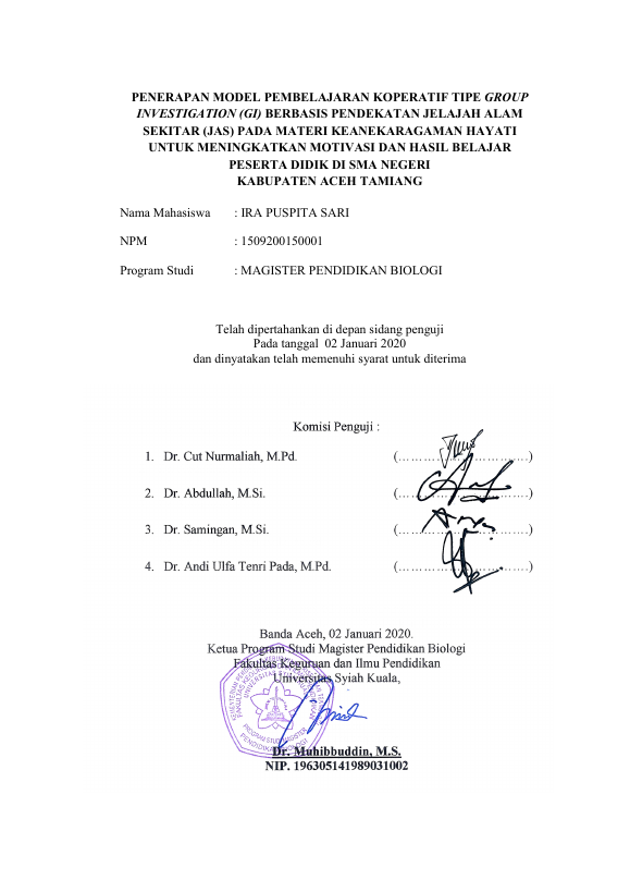 PENERAPAN MODEL PEMBELAJARAN KOPERATIF TIPE GROUP INVESTIGATION (GI) BERBASIS PENDEKATAN JELAJAH ALAM RNSEKITAR (JAS) PADA MATERI KEANEKARAGAMAN HAYATI RNUNTUK MENINGKATKAN MOTIVASI DAN HASIL BELAJAR RNPESERTA DIDIK DI SMA NEGERI RNKABUPATEN ACEH TAMIANG. Banda Aceh Fakultas KIP Magister Pendidikan Biologi,2023