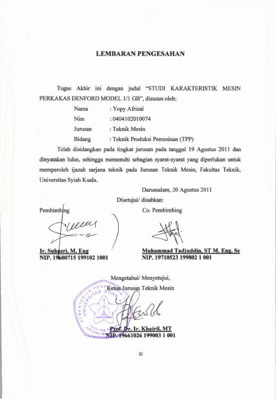 Yopy Afrizal, STUDI KARAKTERISTIK MESIN PERKAKAS DENFORD MODEL 1/1 GB. Banda Aceh Fakultas Teknik,2011