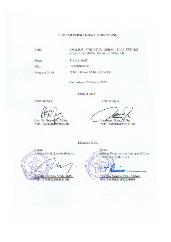 RIVA LIHADI, ANALISIS STRUKTUR GERAK TARI KESUME GAYO DI KABUPATEN ACEH TENGAH. Banda Aceh Fakultas KIP Pendidikan Sendratasik,2023
