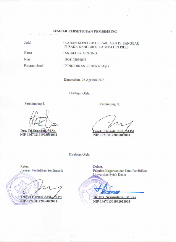 Anjali Br Ginting, KAJIAN KOREOGRAFI TARI GAH DI SANGGAR PUSAKA NANGGROE KABUPATEN PIDIE. Banda Aceh Fakultas KIP Pendidikan Sendratasik,2023