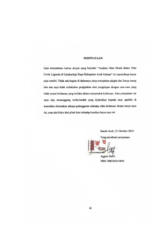 ANGGRIA SHARLI, ANALISIS NILAI MORAL DALAM TEKS CERITA LEGENDA DI LABUHANHAJI RAYA KABUPATEN ACEH SELATAN. Banda Aceh Fakultas KIP Pendidikan Bahasa Indonesia,2023