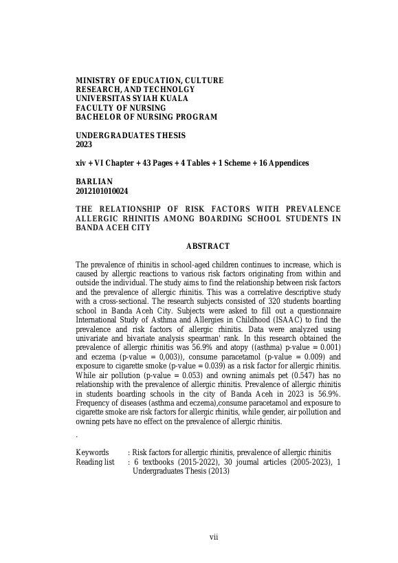 Baca Juga : PERBANDINGAN KEJADIAN RINITIS ALERGI ANTARA SISWA BOARDING SCHOOL DAN NON-BOARDING SCHOOL DI KOTA BANDA ACEH (Aqil Yuniawan Tasrif, 2018)