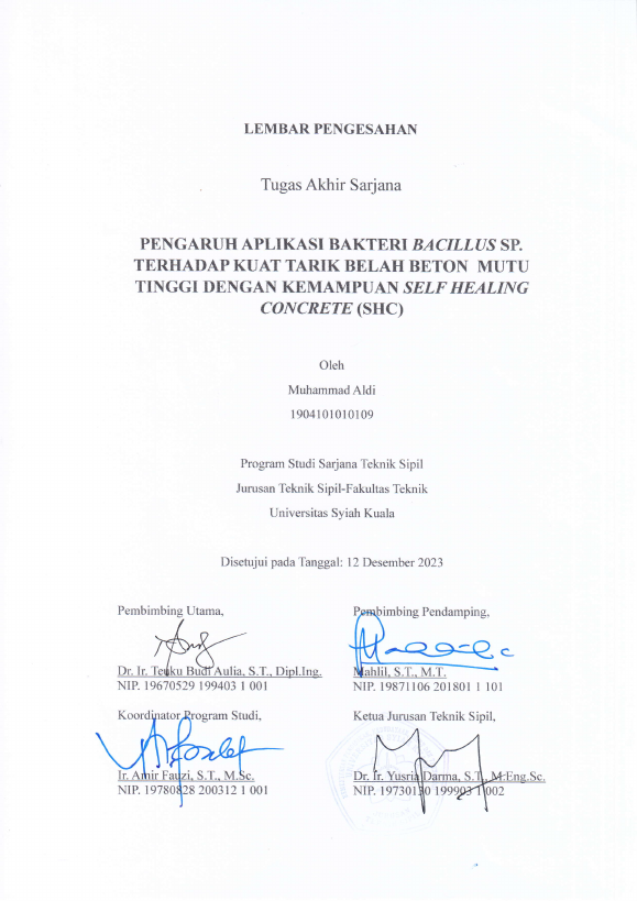 MUHAMMAD ALDI, PENGARUH APLIKASI BAKTERI BACILLUS SP. TERHADAP KUAT TARIK BELAH BETON MUTU TINGGI DENGAN KEMAMPUAN SELF HEALING CONCRETE (SHC). Banda Aceh Fakultas Teknik,2023