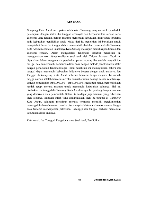 FACHIRA OKTAVIANI LONTOH, PERAN IBU TUNGGAL DALAM MEMENUHI KEBUTUHAN DASAR ANAK (FENOMENA DI GAMPONG KUTA ATEUH KECAMATAN SUKAKARYA KOTA SABANG). Banda Aceh Fakultas Ilmu Sosial dan Ilmu Politik,2023