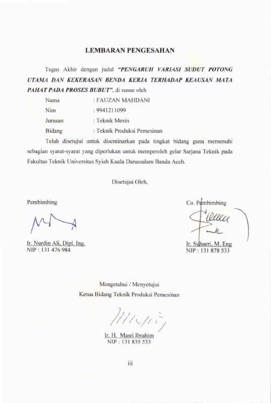 FAUZAN MAHDANI, PENGARUH VARIASI SUDUT POTONG UTAMA DAN KEKERASAN BENDA KERJA TERHADAP KEAUSAN MATA PAHATRNPADA PROSES BUBUT. Banda Aceh Fakultas Teknik,2006