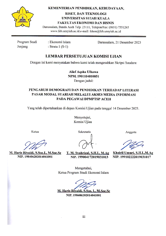 ALIEF AQSHA ULHAWA, PENGARUH DEMOGRAFI DAN PENDIDIKAN TERHADAP LITERASI PASAR MODAL SYARIAH MELALUI AKSES MEDIA INFORMASI PADA PEGAWAI DPMPTSP ACEH. Banda Aceh Fakultas Ekonomi,2023