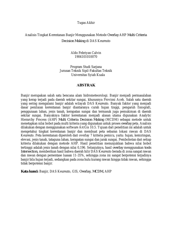 Aldo Febriyan Calvin, ANALISIS TINGKAT KERENTANAN BANJIR MENGGUNAKAN METODE OVERLAY AHP MULTI CRITERIA DECISION MAKING DI DAS KEUREUTO. Banda Aceh Fakultas Teknik Sipil,2023