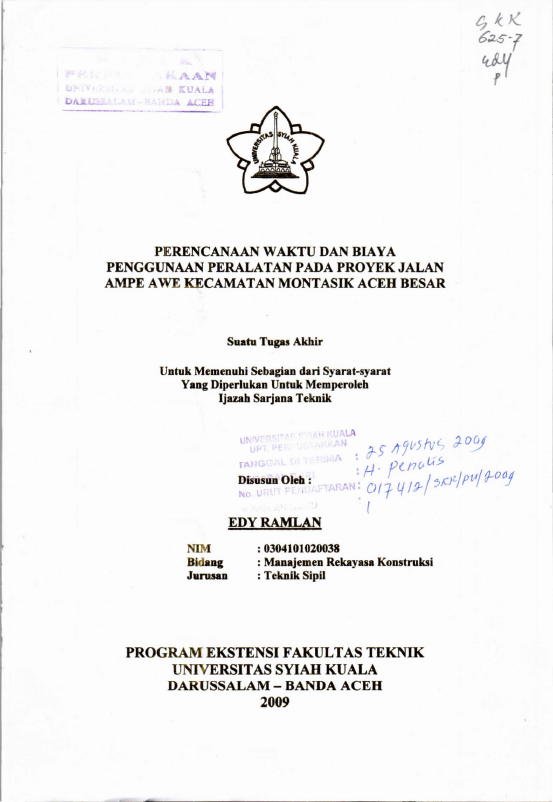 EDY RAMLAN, PERENCANAAN WAKTU DAN BIAYA PENGGUNAAN PERALATAN PADA PROYEK JALAN AMPE AWE KECAMATAN MONTASIK ACEH BESAR. Banda Aceh Fakultas Teknik,2009