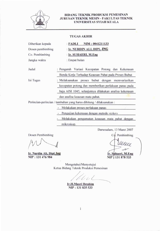 FADLI, PENGARUH VARIASI KECEPATAN POTONG DAN KEKERASAN BENDA KERJA TERHADAP KEAUSAN PAHAT PADA PROSES BUBUT. Banda Aceh Fakultas Teknik,2007