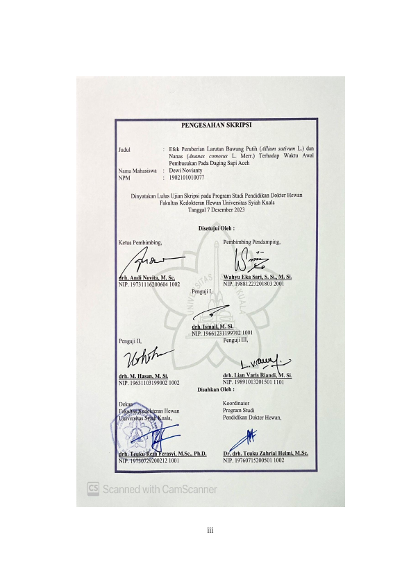 DEWI NOVIANTY, EFEK PEMBERIAN LARUTAN BAWANG PUTIH (ALLIUM SATIVUM L.) DAN NANAS (ANANAS COMOSUS L. MERR.) TERHADAP WAKTU AWAL PEMBUSUKAN PADA DAGING SAPI ACEH. Banda Aceh Fakultas Kedokteran Hewan,2024