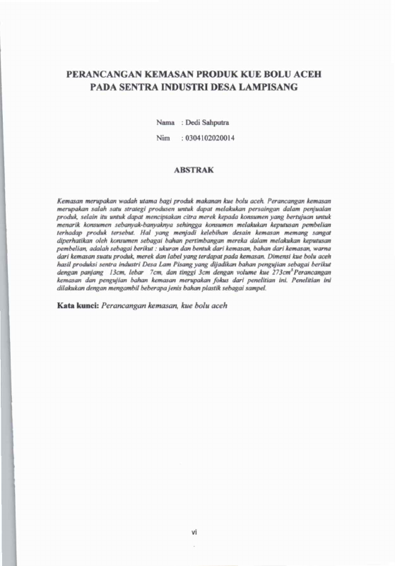 Dedi Sahputra, PERANCANGAN KEMASAN PRODUK KUE BOLU ACEH PADA SENTRA INDUSTRI DESA LAMPISANG. Banda Aceh Fakultas Teknik,2010