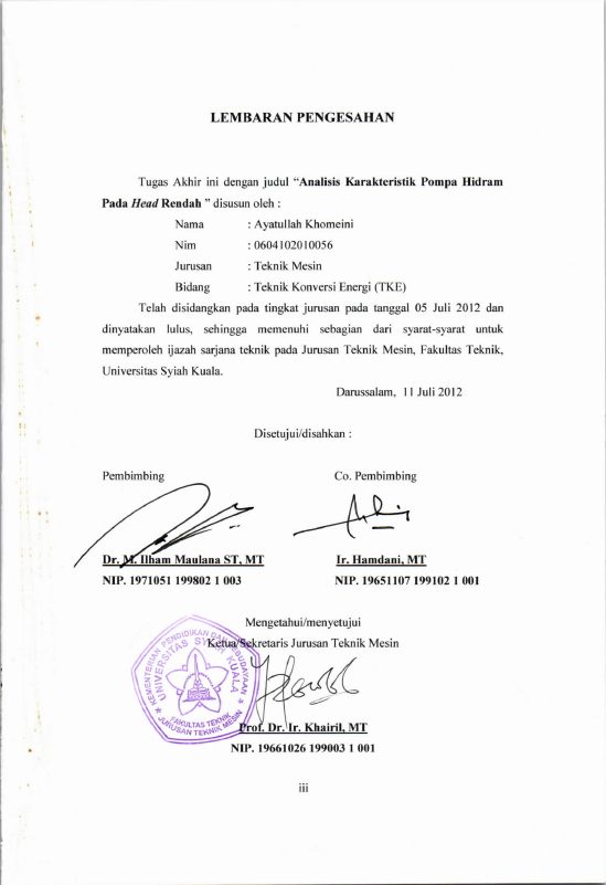 AYATULLAH KHOMEINI, ANALISIS KARAKTERISTIK POMPA HIDRAM PADA HEAD RENDAH. Banda Aceh Fakultas Teknik,2012