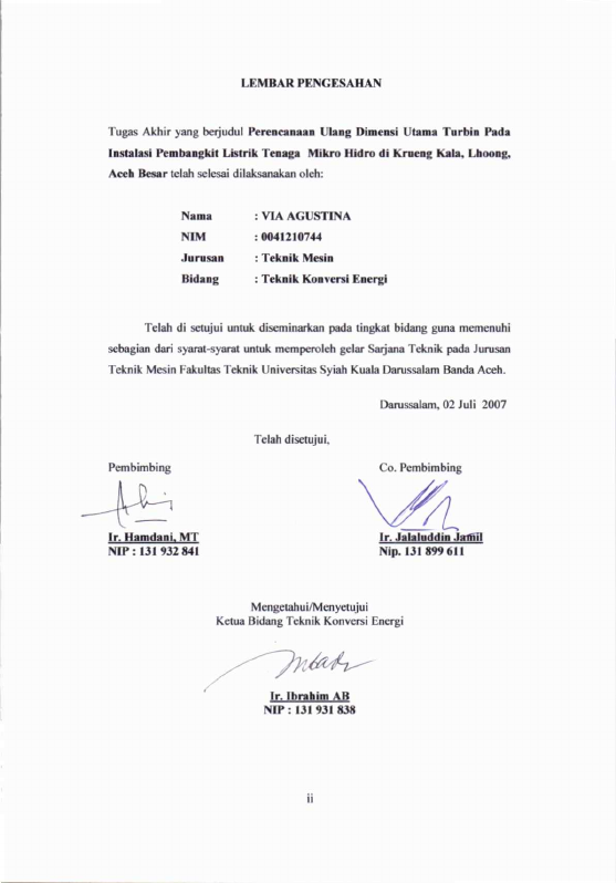 VIA AGUSTINA, PERENCANAAN ULANG DIMENSI UTAMA TURBIN PADA INSTALASI PEMBANGKIT LISTRIK TENAGA MIKRO HYDRO DI KRUENG KALA, LHOONG, ACEH BESAR. Banda Aceh Fakultas Teknik,2007