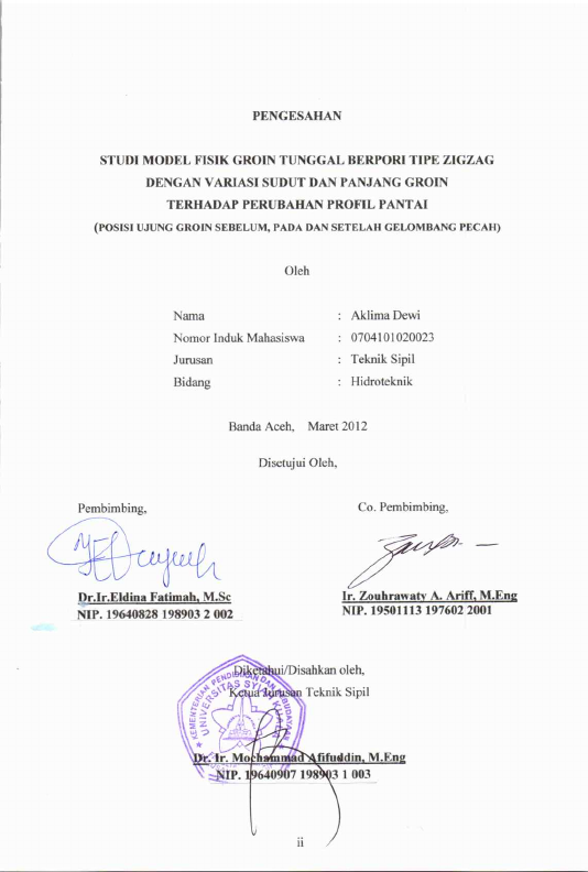 Baca Juga : STUDI MODEL FISIK GROIN BERPORI TIPE ZIG-ZAG YANG DISUSUN SERI DENGAN VARIASI SUDUT TERHADAP PERUBAHAN PROFIL PANTAI (POSISI UJUNG GROIN PADA BREAKER ZONE) (TURSINA, 2024)