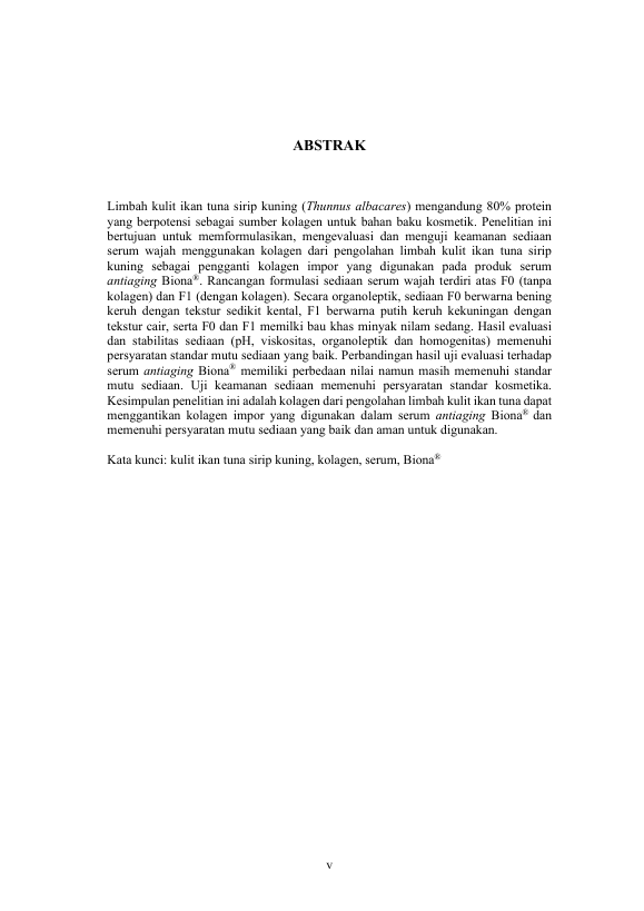 AJA SYARIFAH MUTHMAINNAH, FORMULASI DAN EVALUASI HASIL SUBTITUSI KOLAGEN PADA BIONA® SERUM ANTI-AGING DARI LIMBAH KULIT IKAN TUNA SIRIP KUNING (THUNNUS ALBACARES). Banda Aceh Fakultas MIPA Farmasi,2024