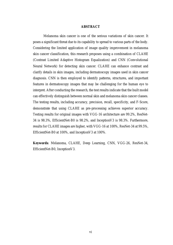 Yulia Sufani, KLASIFIKASI PENYAKIT KANKER KULIT MELANOMA DENGAN PENINGKATAN KUALITAS CITRA MENGGUNAKAN CLAHE DAN DEEP LEARNING. Banda Aceh Fakultas Teknik,2024