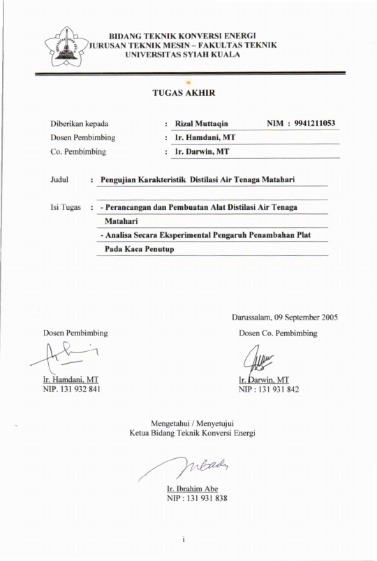 RIZAL MUTTAQIN, PENGUJIAN KARAKTERISTIK DISTILASI AIR TENAGA MATAHARI. Banda Aceh Fakultas Teknik,2007