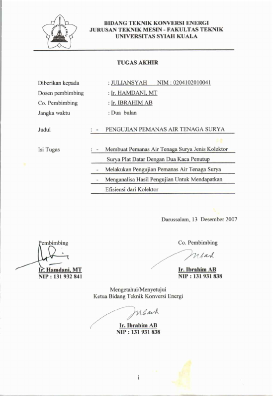 Juliansyah, PENGUJIAN PEMANAS AIR TENAGA SURYA. Banda Aceh Fakultas Teknik,2008