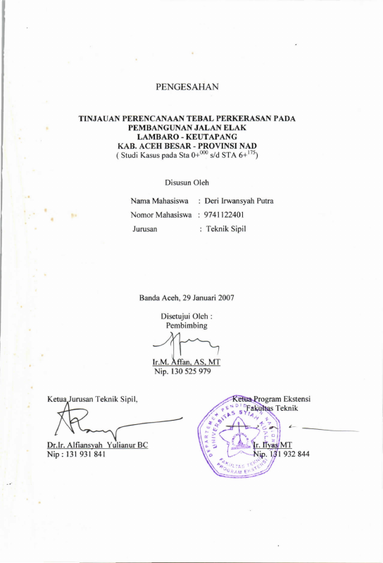 Deri Irwansyah putra, TINJAUAN PERENCANAAN TEBAL PERKERASAN PADA PEMBANGUNAN JALAN ELAK LAMBARO- KEUTAPANG KAB. ACEH BESAR. Banda Aceh Fakultas Teknik,2007