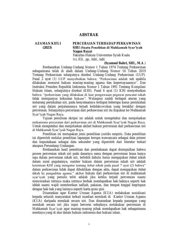 Azaman Kifli, PERCERAIAN TERHADAP PERKAWINAN SIRI (SUATU PENELITIAN DI MAHKAMAH SYAR’IYAH NAGAN RAYA). Banda Aceh Fakultas Hukum (S1),2024