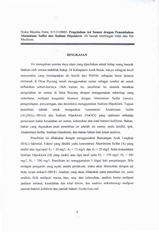 Sixka mustika putri, PENGOLAHAN AIR SUMUR DENGAN PENAMBAHAN ALUMINIUM SULFAT DAN SODIUM HIPOKLORIT. Banda Aceh Fakultas Pertanian,2007