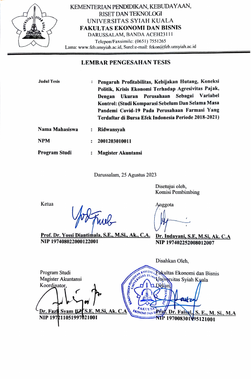 Ridwansyah, PENGARUH PROFITABILITAS, KEBIJAKAN HUTANG, KONEKSI POLITIK, KRISIS EKONOMI TERHADAP AGRESIVITAS PAJAK, DENGAN UKURAN PERUSAHAAN SEBAGAI VARIABEL KONTROL: (STUDI KOMPARASI SEBELUM DAN SELAMA MASA PANDEMI COVID-19 PADA PERUSAHAAN FARMASI YANG TERDAFTAR DI BURSA EFEK INDONESIA PERIODE 2018-2021). Banda Aceh Prog. Studi Magister Ilmu Akuntansi,2024