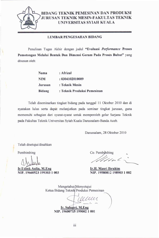 AFRIZAL, EVALUASI PERFORMANCE PROSES PEMOTONGAN MELALUI BENTUK DAN DIMENSI GERAM PADA PROSES BUBUT. Banda Aceh Fakultas Teknik,2010