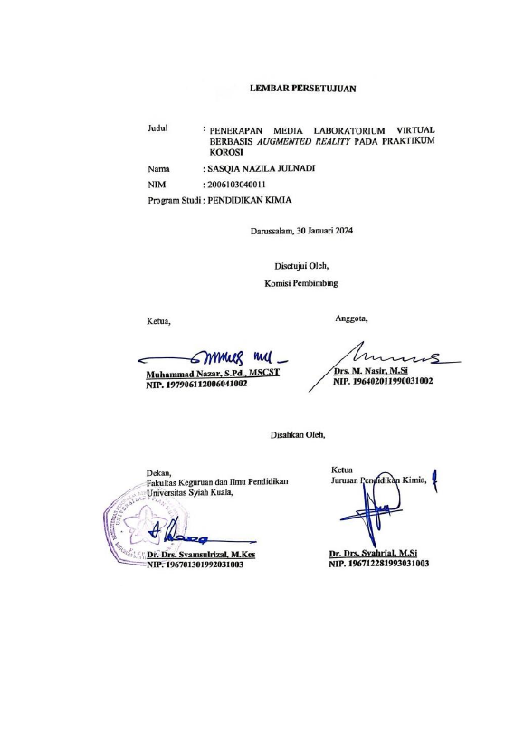 Sasqia Nazila Julnadi, PENERAPAN MEDIA LABORATORIUM VIRTUAL BERBASIS AUGMENTED REALITY PADA PRAKTIKUM KOROSI. Banda Aceh Fakultas KIP Kimia,2024