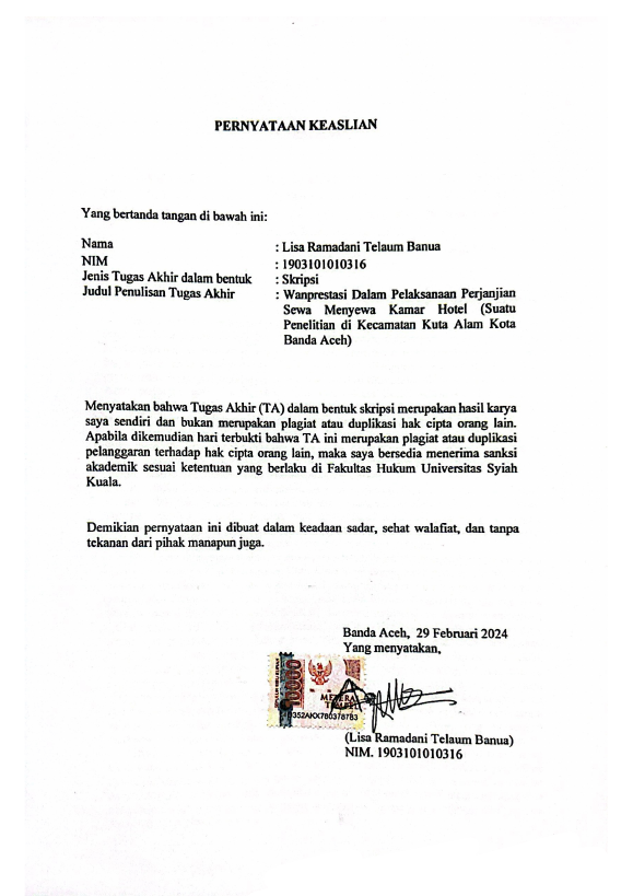 Baca Juga : WANPRESTASI DALAM PERJANJIAN SEWA MENYEWA KAMAR KOS (PENELITIAN DI KECAMATAN KUTA ALAM KOTA BANDA ACEH) (MUHAMMAD AJRUL ADHHA MULZAN, 2025)