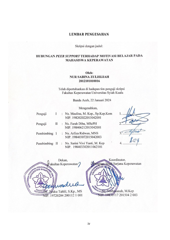 Nur Sabina Zulhijjah, HUBUNGAN PEER SUPPORT TERHADAP MOTIVASI BELAJAR PADA MAHASISWA KEPERAWATAN. Banda Aceh Fakultas Keperawatan,2024